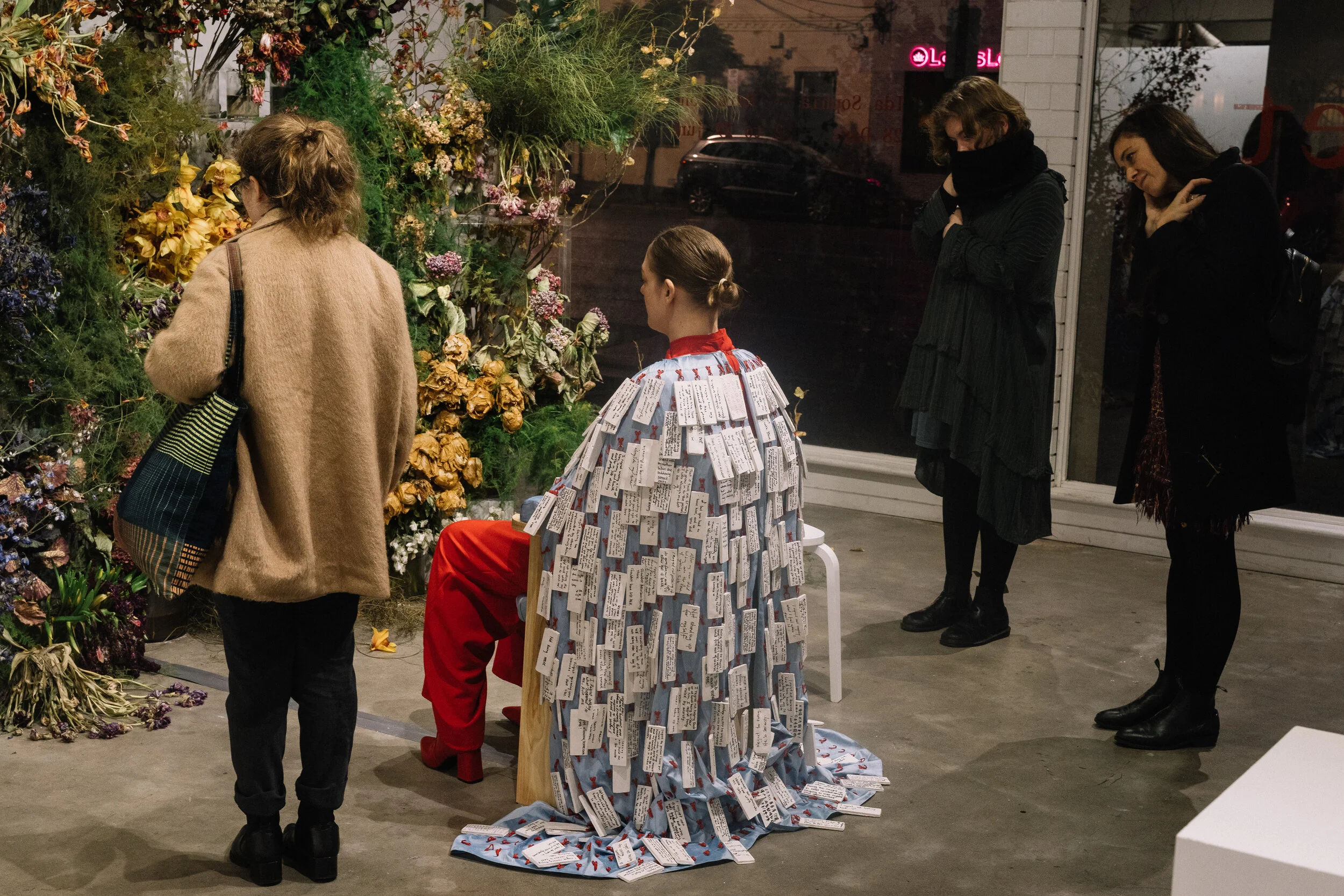 Participatory practice is a central focus of Ida’s practice as she believes that it allows the artist to create opportunities for deep and meaningful encounters through art and with each other. To facilitate broader engagement with the universal themes of regret, disappointment and the wish for atonement in her work, participants are invited to write their own regrets onto one of 1,000 white plaster writing tablets and attach them to the corresponding 1,000 red hooks that adorn Ida’s blue cape. The cape will grow heavier each day as regrets are declared and unburdened, the weight of these regrets literally given to the artist to bear as she performs her act of contrition. “We carry regret around for so long that it becomes a part of us — it’s so heavy,” Ida says. “We do not realise how its weight prevents us from living fully, we drag it around into everything we do, every interaction we have.” By inviting participants to add their regrets, it is Ida’s intention that Regret will be a vessel that allows people to be gently nudged to reflect on the weight of regret in their own lives and to decide if they would like to undertake work to release themselves from these feelings.