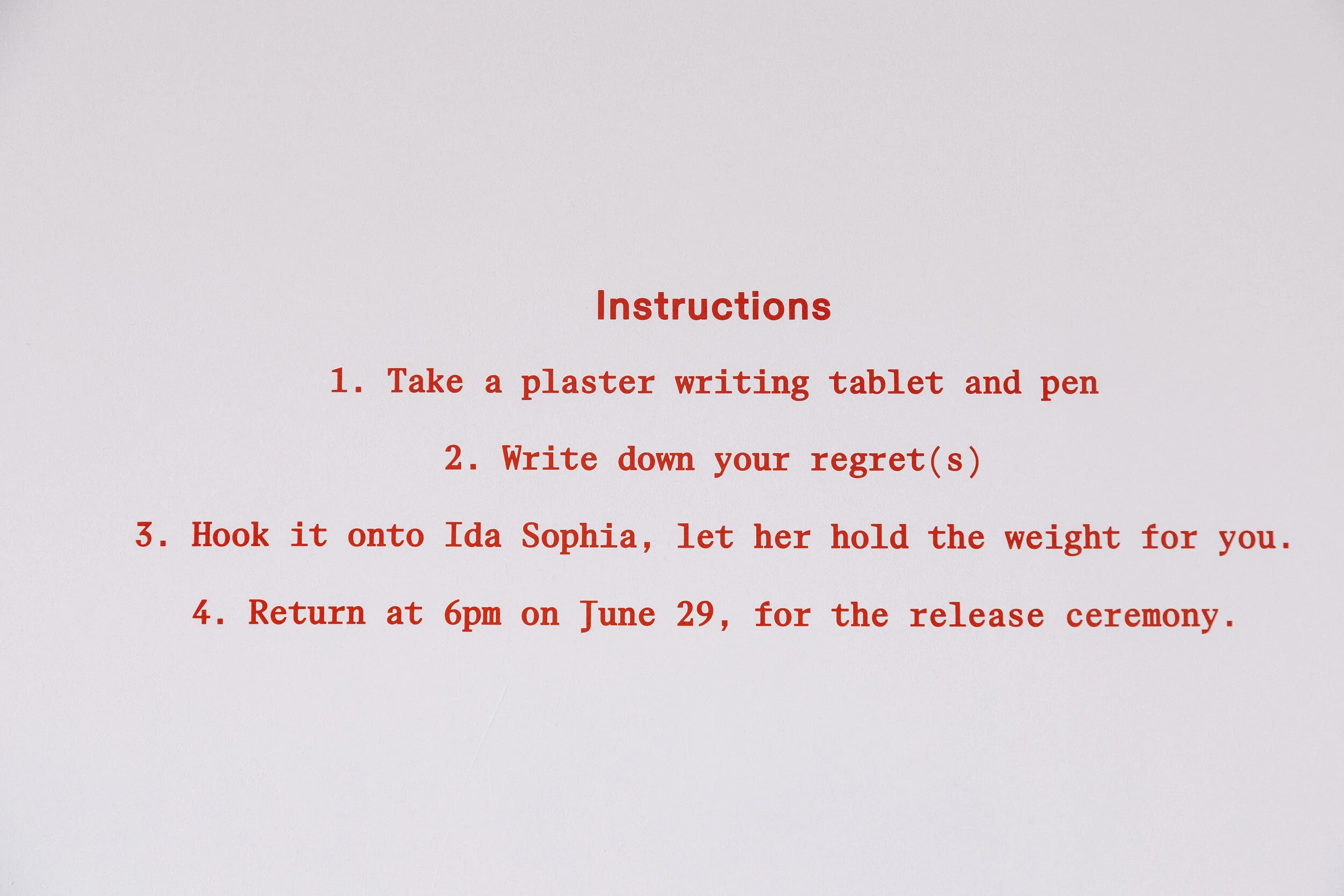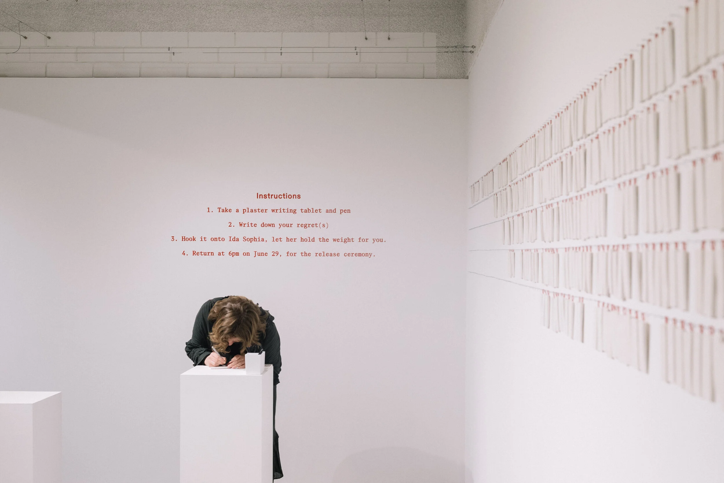 While regret is a titular theme of this performance, redemption through sincere and authentic action is equally essential in understanding both the motivation and intention of Ida’s emotionally laborious ritual. On the last day of her self-imposed captivity, Ida will rise from her chair and cast off the plaster-laden cloak that has steadily engulfed and weighed her down over the past month. In casting off both her personal regrets and the collective regrets of all those who have unburdened themselves, Ida liberates herself from the guilt and shame of the past to walk unencumbered into the future. This final ritualised act on the path to self-realised redemption underscores the transformative power of the performance by offering an empowering resolution to both the narrative of grief that has been central to Ida’s practice and to the regret that has tinged the memories of her father. “Yes, the purpose of this performance is to mourn, but it is really to understand, to confront, to make friends with regret and free ourselves from it’s clutches,” Ida says. “A redemptive act can be as small as saying sorry to that one person or as much as needing to be with it for 28 days… I could take another lifetime of days to do this work, to spend time with him. But this is what I am allowed.”