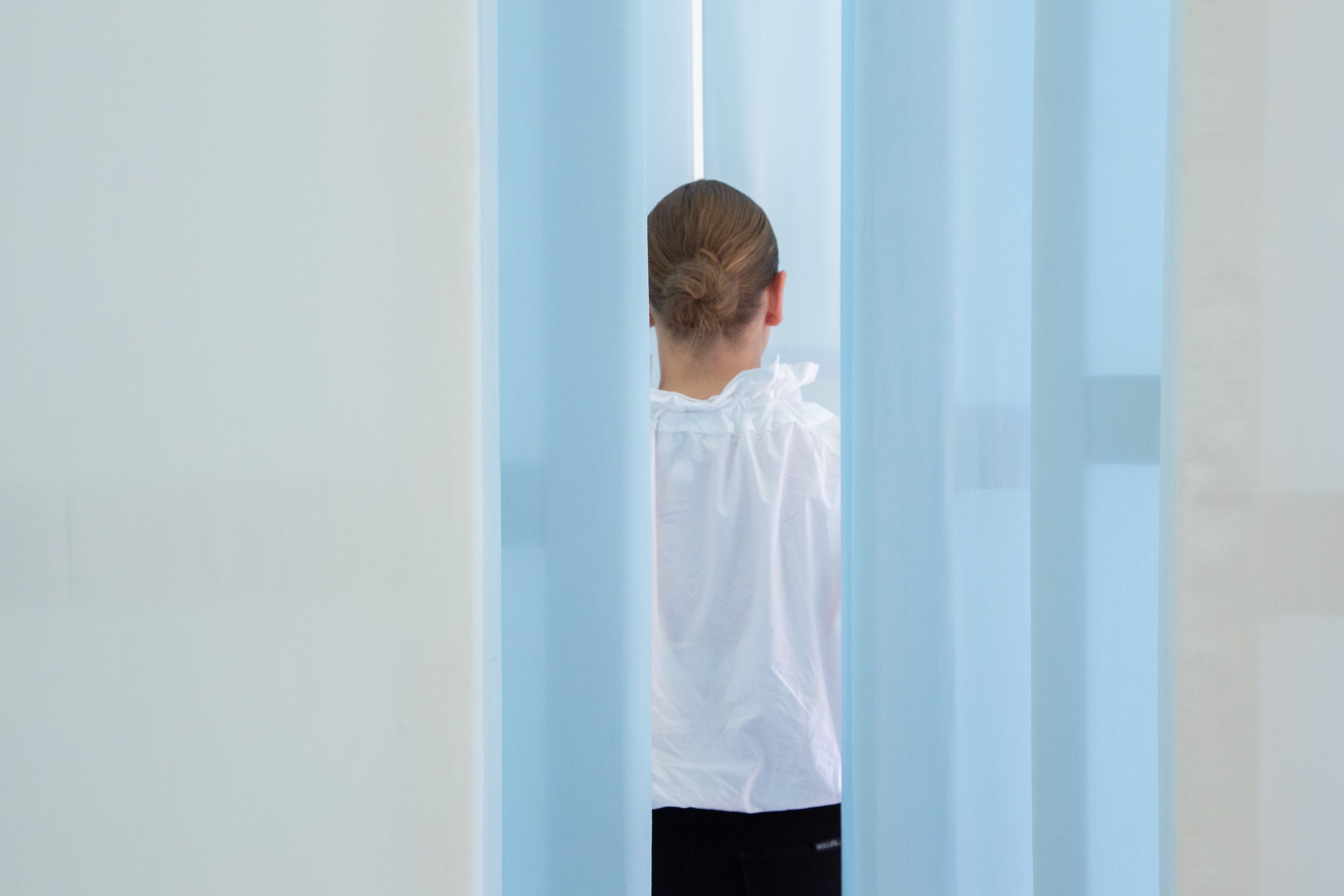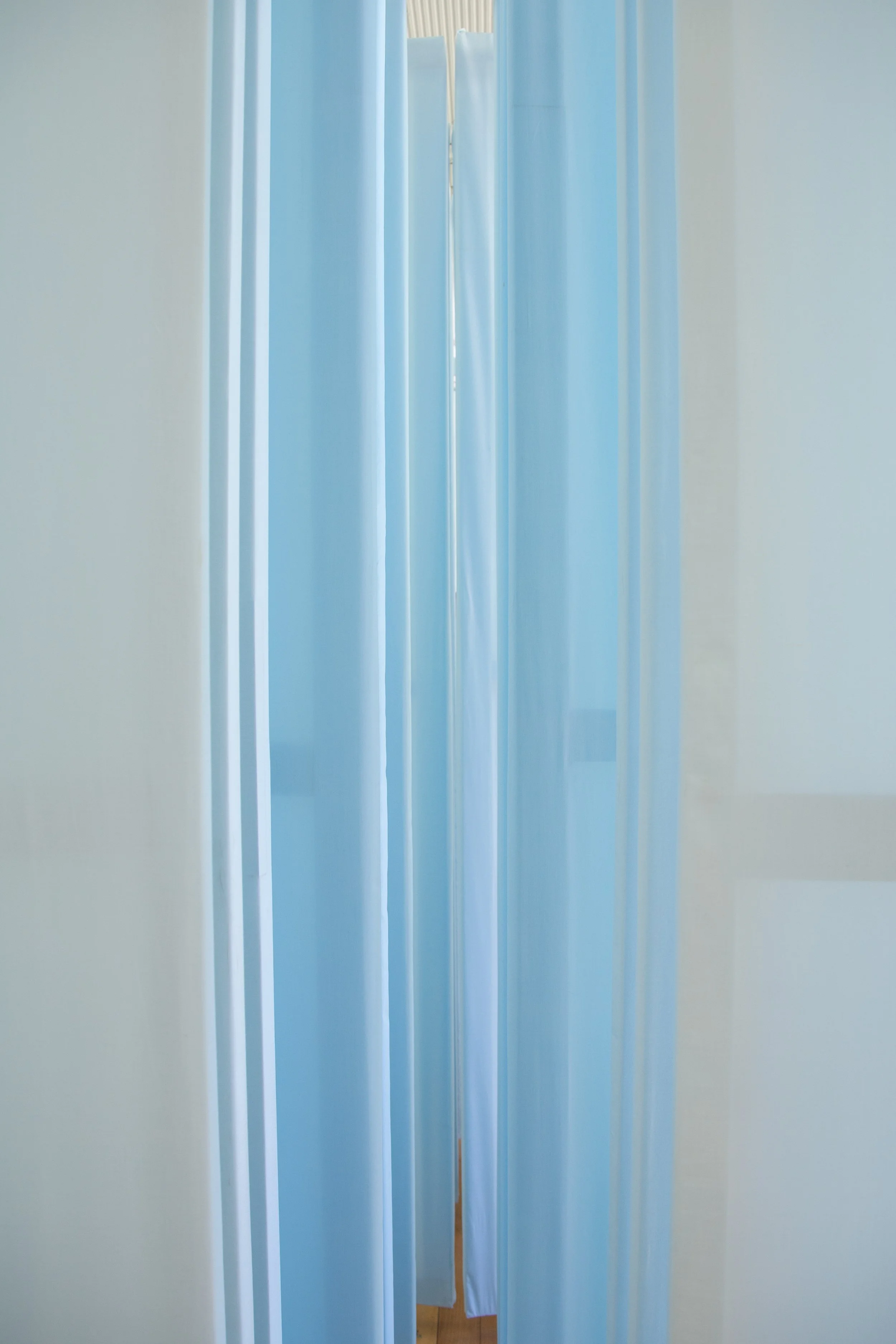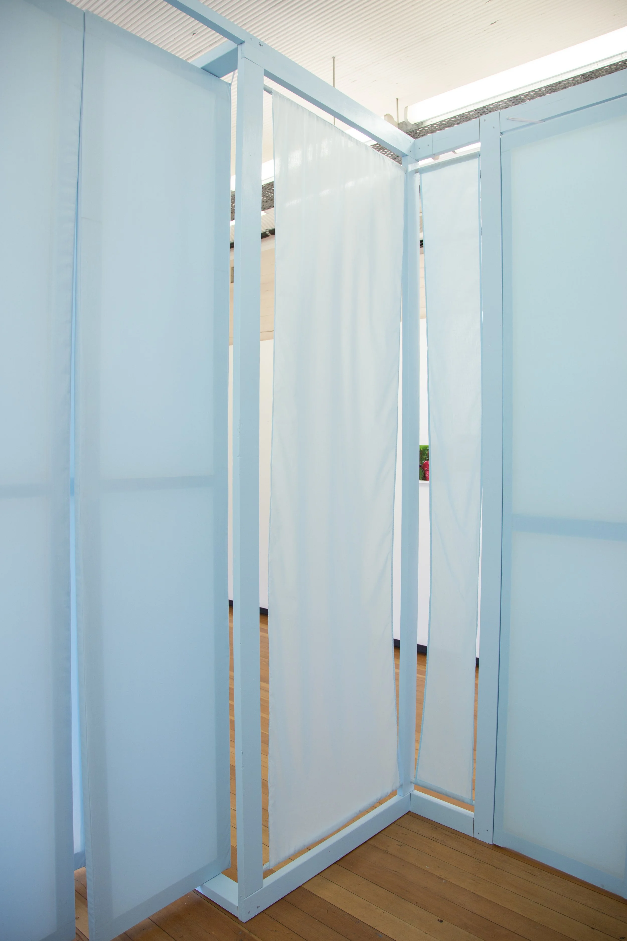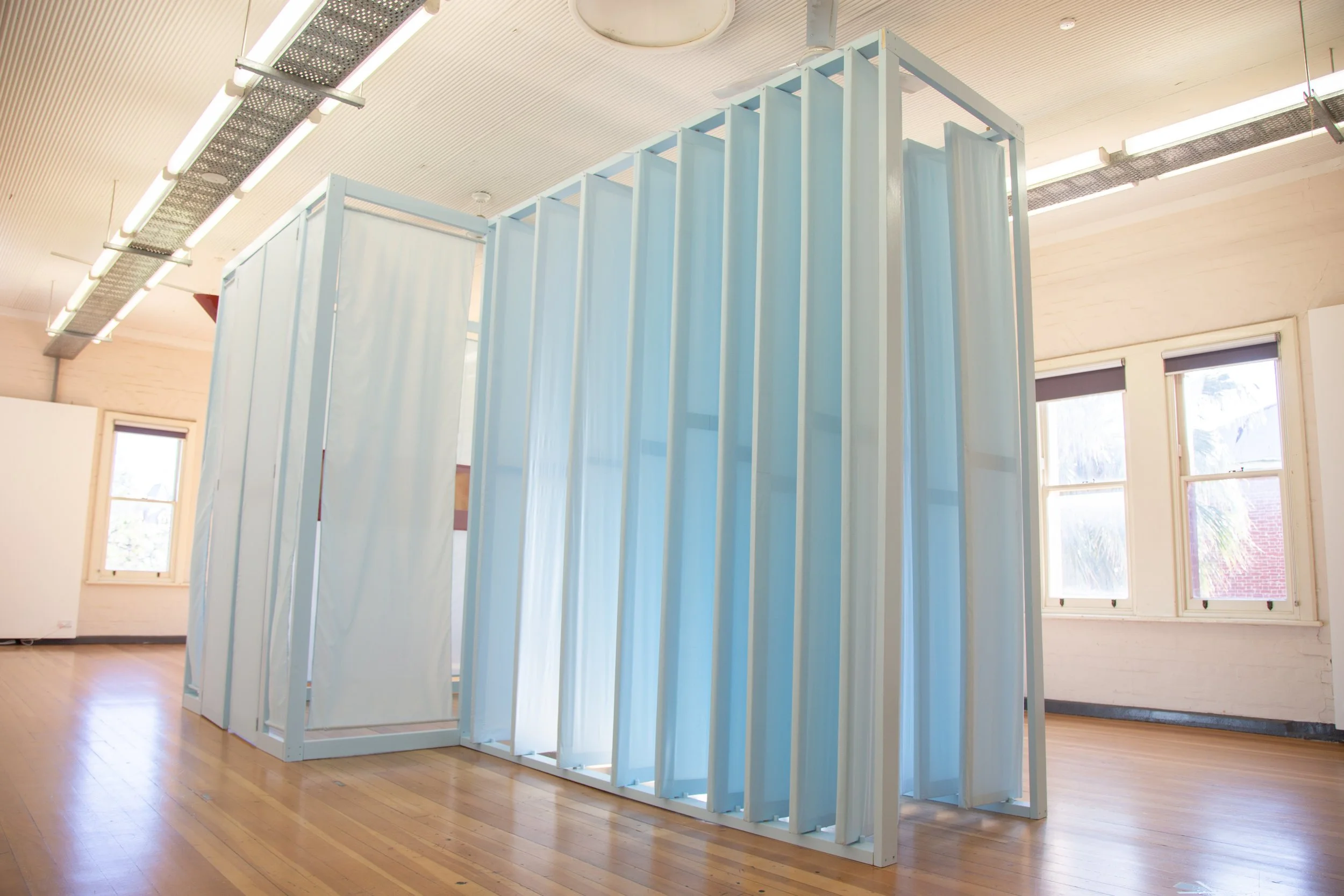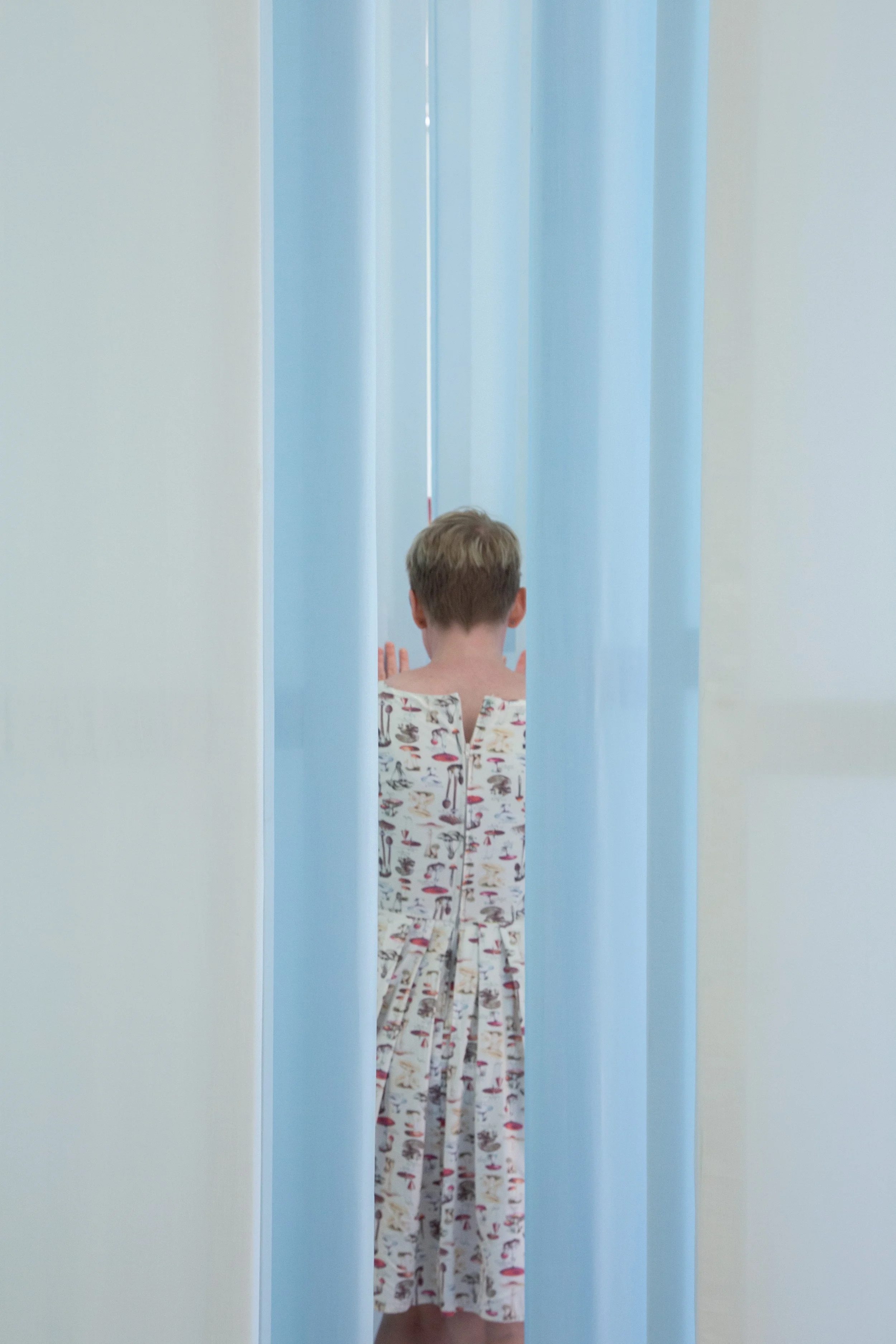 Brightly lit and standing at three metres tall and clad in light blue, the installation is invitational. A series of nine successive pairs of doors open one way and must be pushed; it is an action of choice. As they close behind you automatically, commitment to your choice and follow through is required.